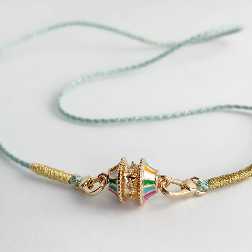 Materiales: Cadena de Cuerda de algodón color aguamarina con un dije de cobre enchapado en oro con incrustaciones de circón.