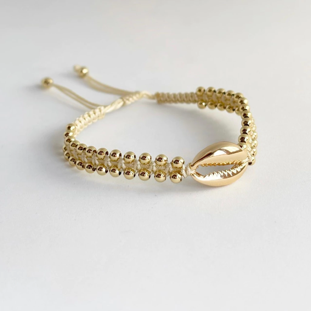Pulsera con diseño moderno y estilo playero, elaborada con cuerda encerada, cuentas y dije de caracola enchapadas en oro. Su combinación de tonos suaves y texturas orgánicas la convierte en una pieza fresca y elegante, perfecta para usar a diario o en vacaciones. Aporta un toque natural y chic a cualquier look.